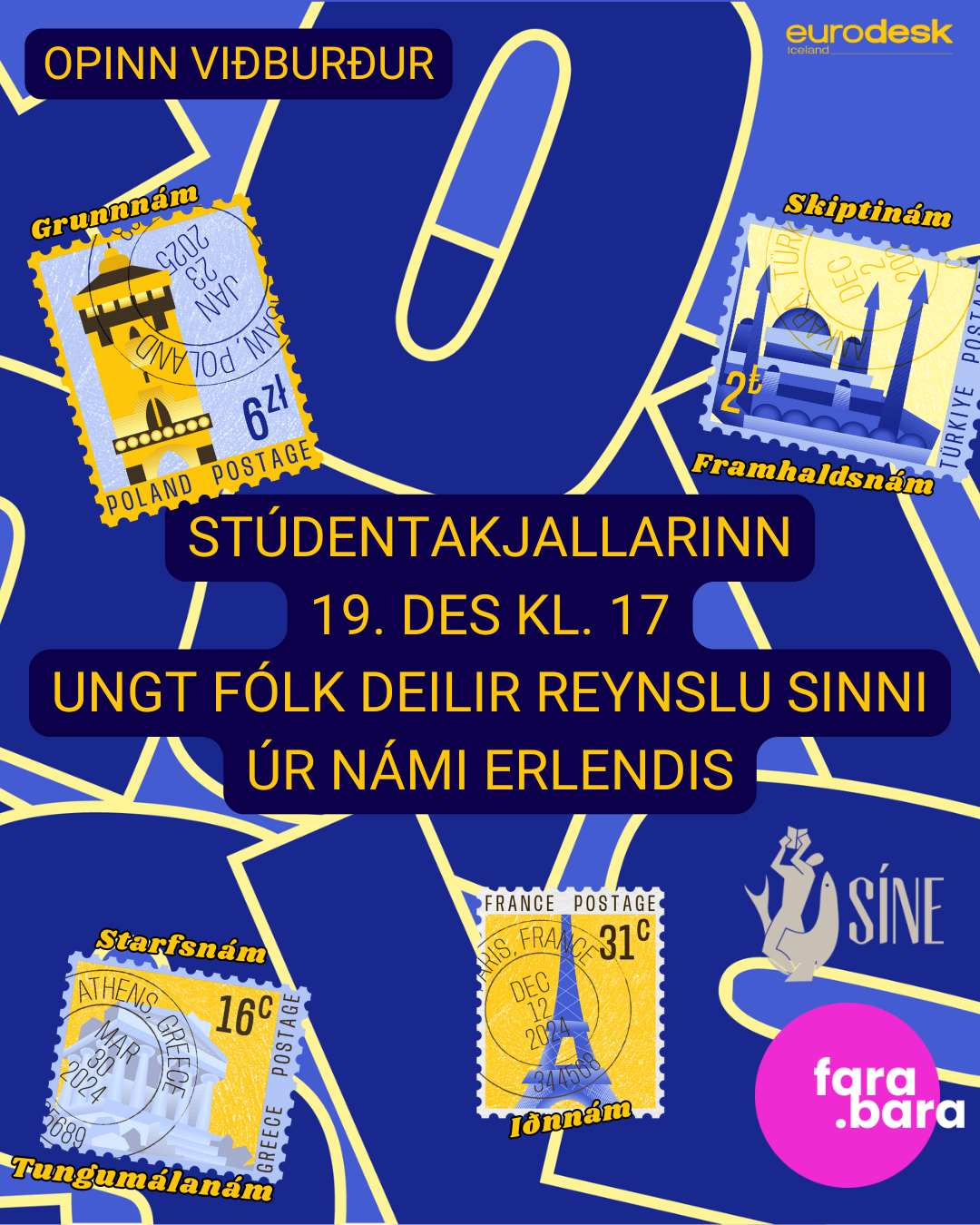 Eurodesk og Upplýsingastofa um nám erlendis, Farabara.is, halda opinn kynningarfund í samstarfi við Samband íslenskra nemenda erlendis (SÍNE) þann 19. des í Stúdentakjallara Háskóla Íslands. Kynningarfundurinn verður á milli kl. 17-19 og verður boðið upp á stutta kynningu á námi erlendis og pallborðsumræðum með ungum nemendum sem hafa farið út í nám. Hægt verður að ræða við þátttakendur á persónulegum nótum og spyrja þeirra spurninga sem helst brenna á.